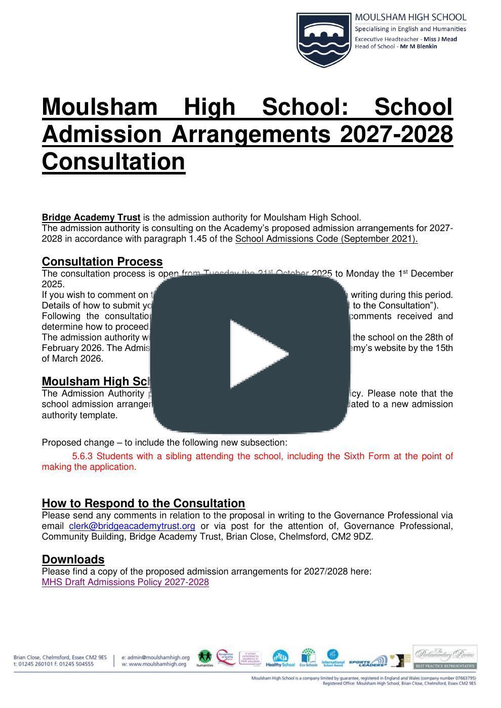Moulsham High School are currently consulting on admission arrangements for 2027-2028.