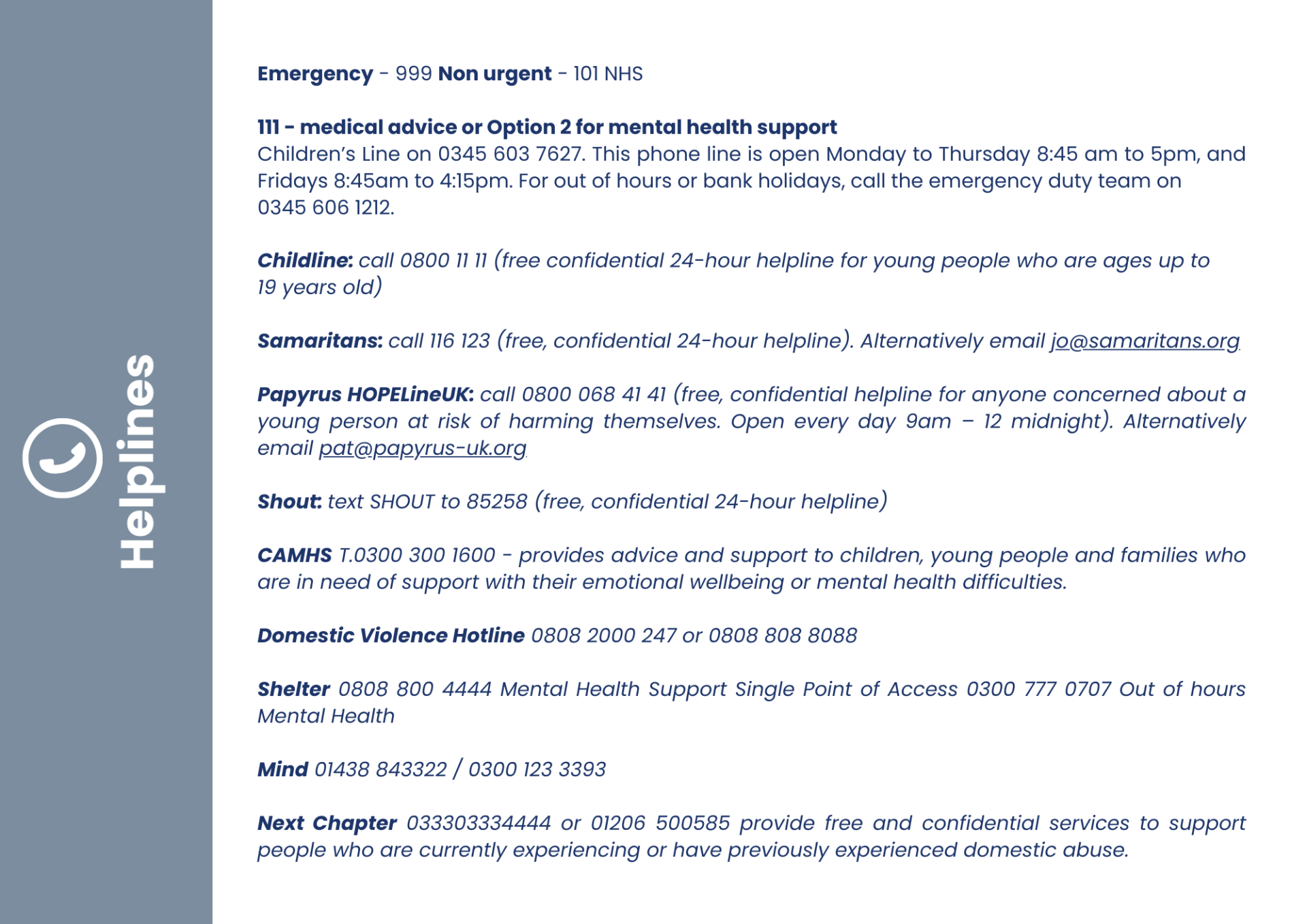 At Moulsham High School, the wellbeing of our students, families and staff is extremely important to us. Sometimes additional support may be needed outside of school, particularly during evenings, weekends or holidays.